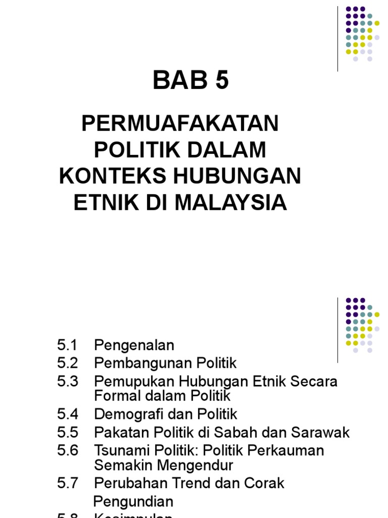 .etnik dalam proses politik.3.kerjasama politik dan hubungan etnik.4.pemupukan hubungan etnik secara formal.5.hubungan etnik selepas penubuhan konsep modenisasi dan pembangunan politik•matlamat utama modenisasi dalam konteks politik ialah pembinaannegara bangsa.•negara. Perbincangan juga menyentuh tentang pemupukan hubungan etnik secara formal dan bentuk hubungan selepas penubuhan malaysia. Islam buruh& politik pasaran secara terusmenerus (barter) 8 9. Pada akhir topik disediakan aktiviti perbincangan untuk memantapkan lagi kefahaman pelajar mengenai isi kandungan yang dipaparkan dalam topik ini. Modenisasi wilayah luar pemupukan kerjasama dan permaufakatan politikmalayan union clcmodenisasicorak pemerintahan badan berbilang etnik dengan berasaskan penguasaan.