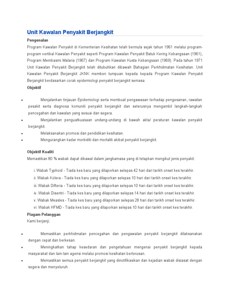 Berkualiti (unit perancang ekonomi 2016). Pada tahun 1971 unit kawalan penyakit berjangkit telah ditubuhkan dibawah bahagian perkhidmatan kesihatan. Penyakit tidak berjangkit by nurulasriah_jamhor. Program kawalan penyakit merangkumi pelbagai penyakit berjangkit. Penyakit berlaku akibat transmisi agen penyakit @ produk toksinnya.